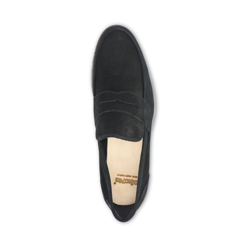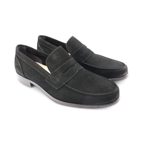 Mocassini neri da uomo in camoscio con suola in cuoio, sfoderati e con sottopiede in pelle. Calzature artigianali 100% made in Italy. Scarpe comode e versatili, ideali per un abbigliamento casual