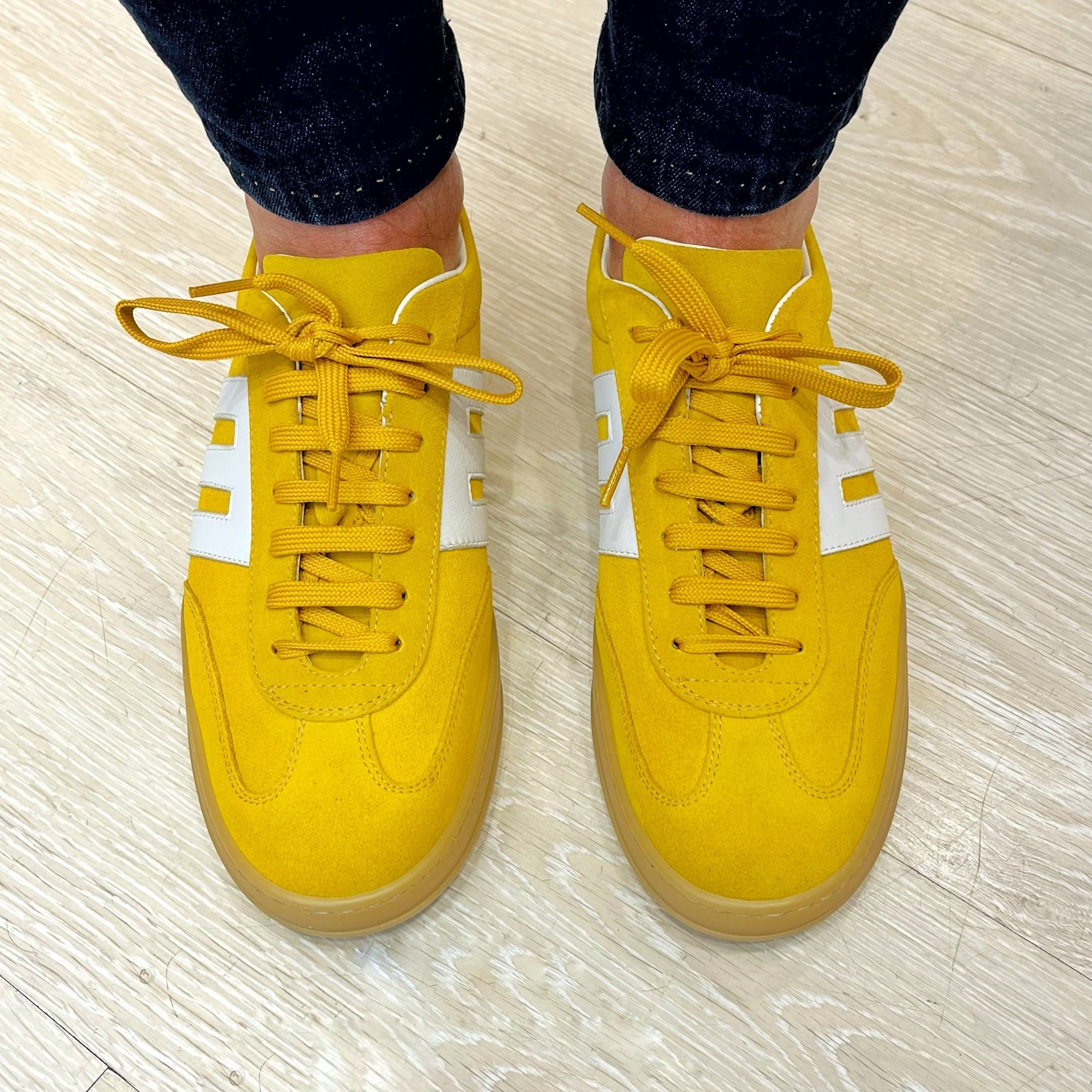 - Design Elegante: Realizzate in pregiata pelle scamosciata gialla, queste sneakers aggiungono un tocco di vivacità e originalità a qualsiasi outfit.